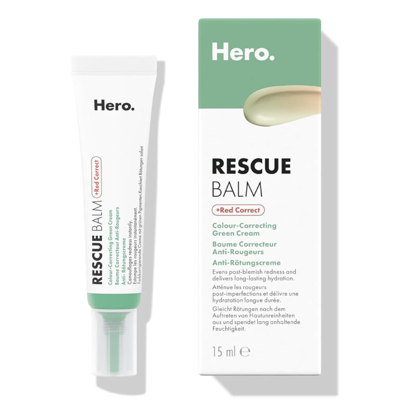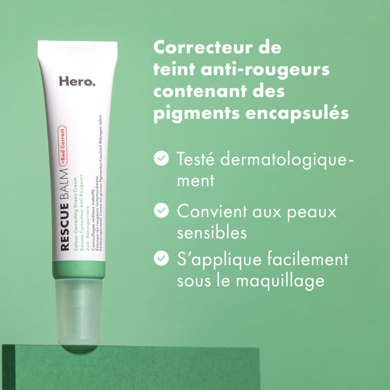 Hero Rescue Balm Red Correct est une crème verte qui change de couleur. Elle contient des pigments encapsulés qui s’activent lors de l’application et passent du vert au beige en quelques secondes. Les rougeurs dues aux imperfections sont atténuées, et ta peau est soignée tout au long de la journée.